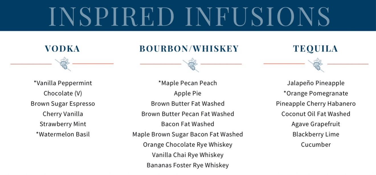 Our infused spirits are the heart of Inspired Infusions. From jalapeño pineapple tequila and apple pie bourbon to brown sugar espresso vodka, our creations transform ordinary drinks into signature experiences.